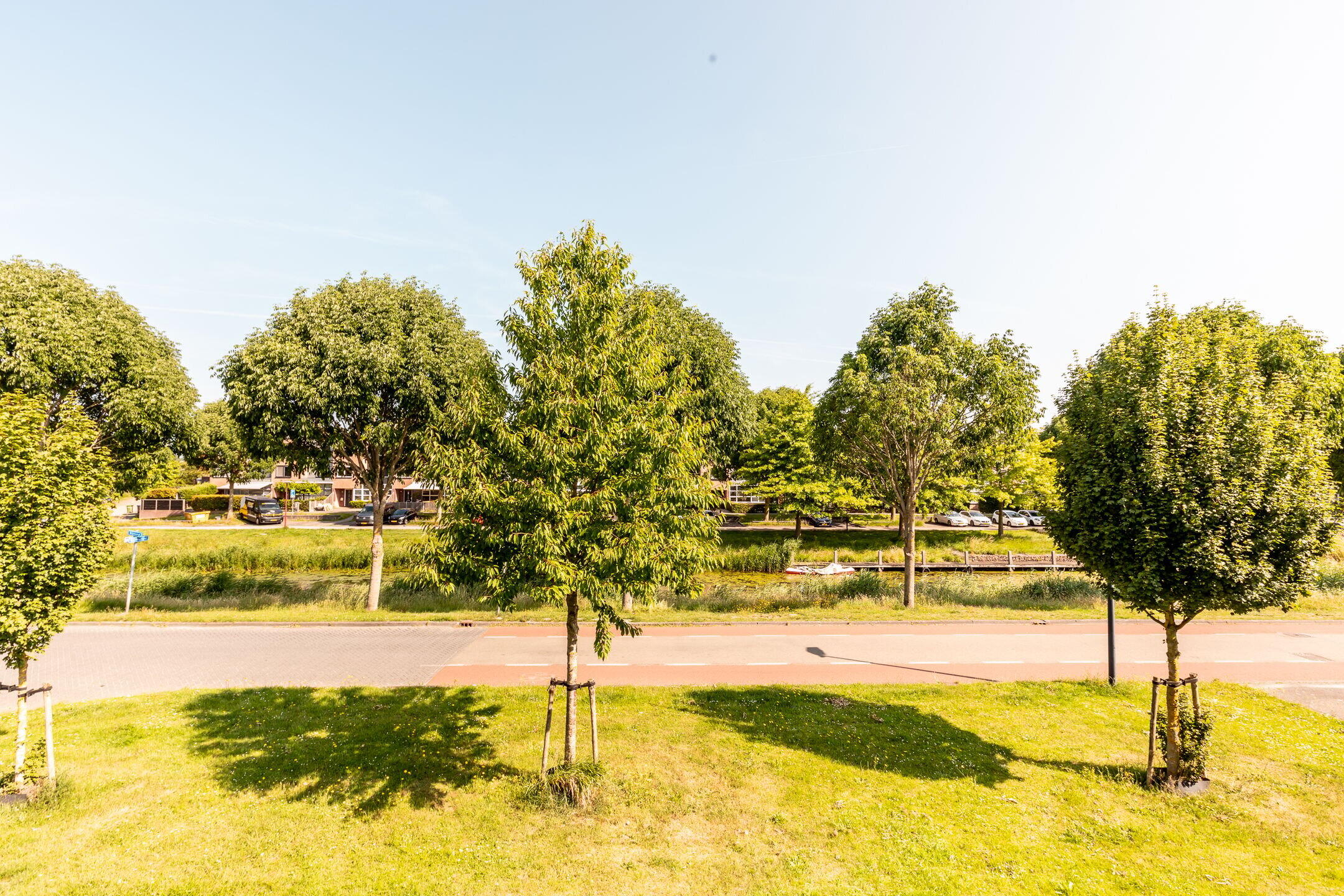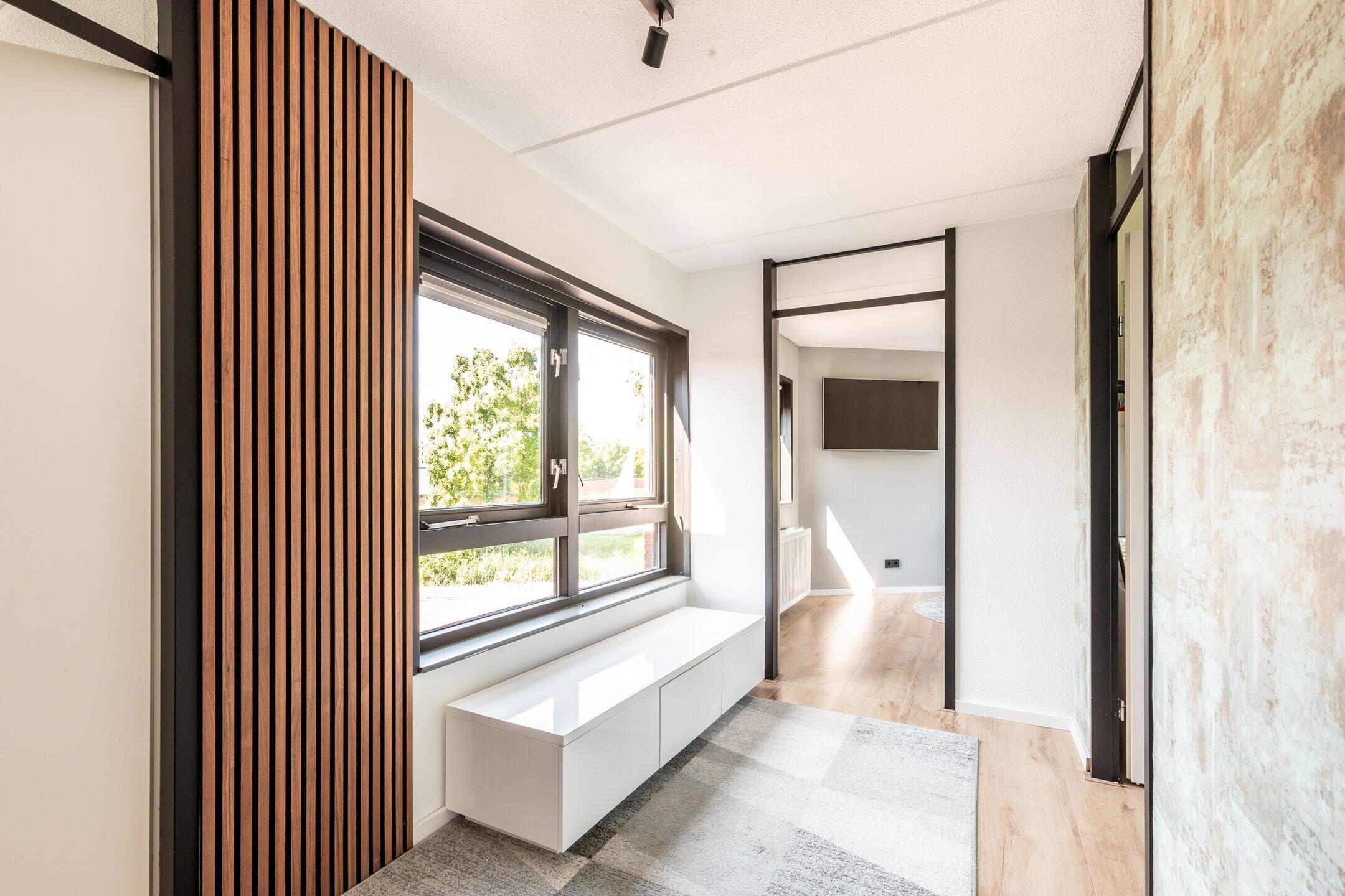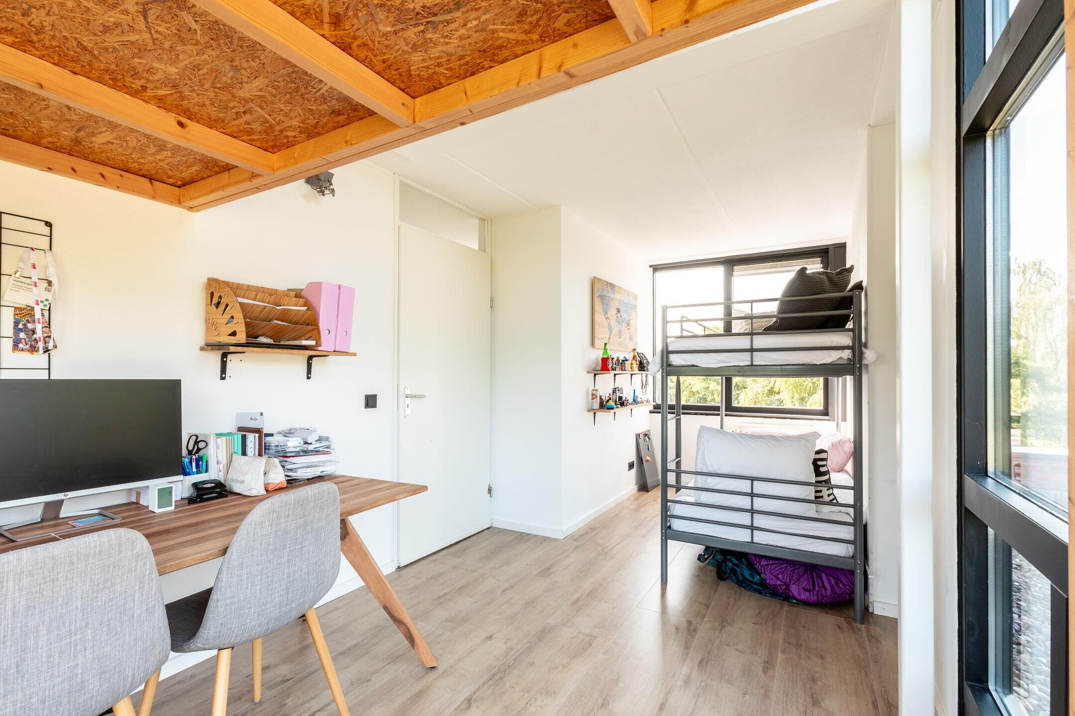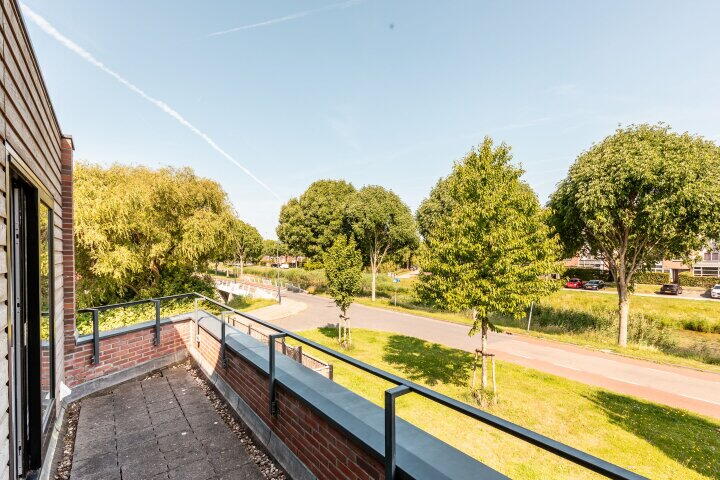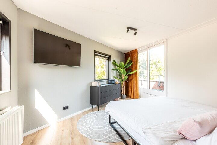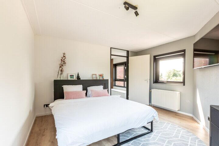 Eerste verdieping: Overloop, drie slaapkamers van respectievelijk 9,6-, 7,6- en 13,5m², waarbij de grootste slaapkamer toegang heeft tot een dakterras/balkon van ca. 10m²; volledig betegelde en in 2021 vernieuwde badkamer welke is voorzien van een inloopdouche, meubel met twee waskommen, hangend toilet en een elektrische radiator.