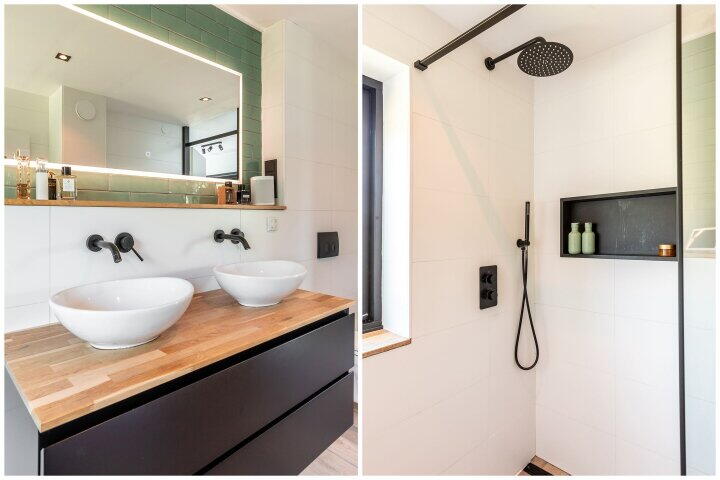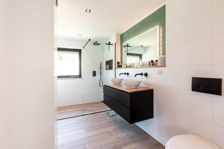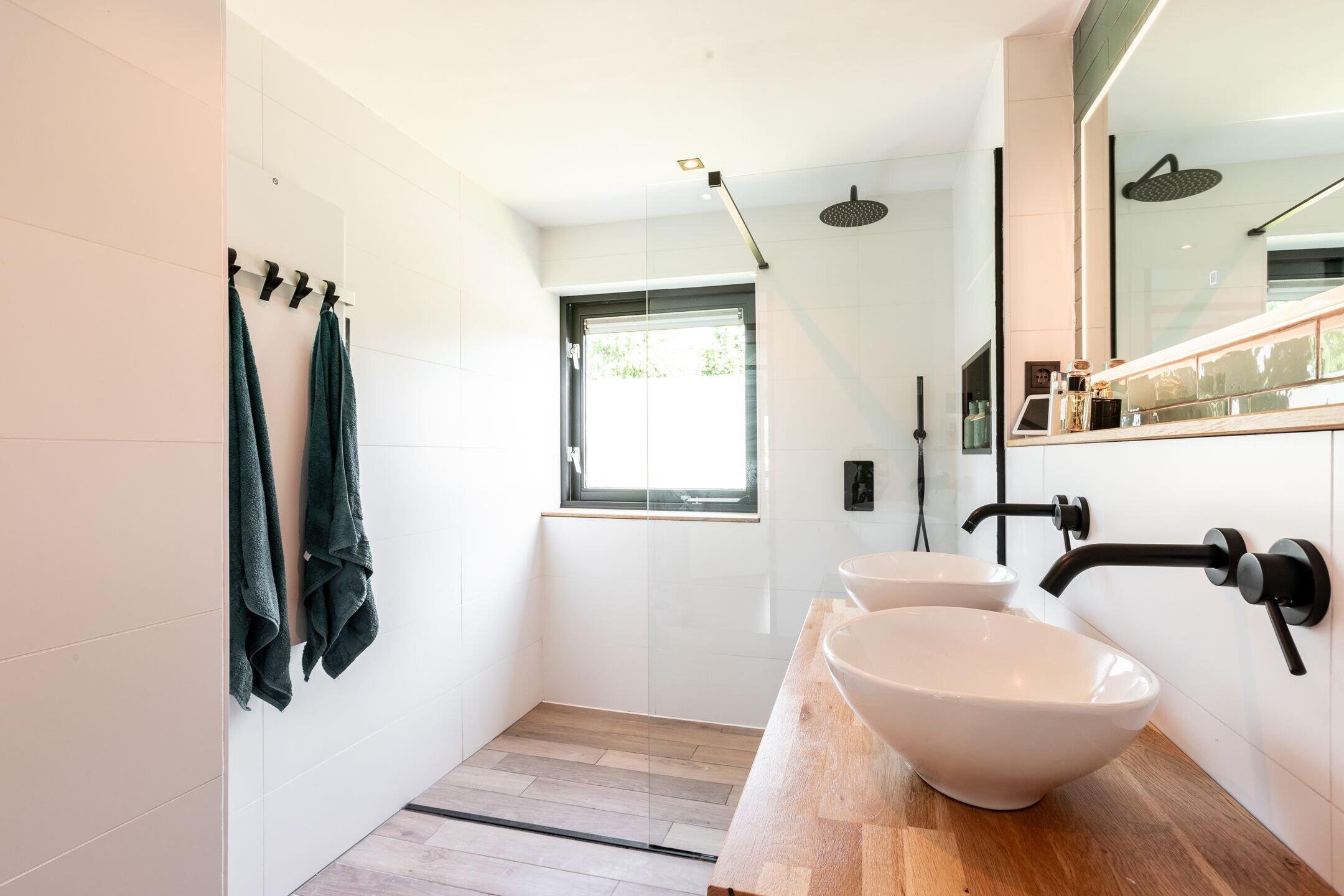 - Douche, dubbele wastafel, toilet, en wastafelmeubel