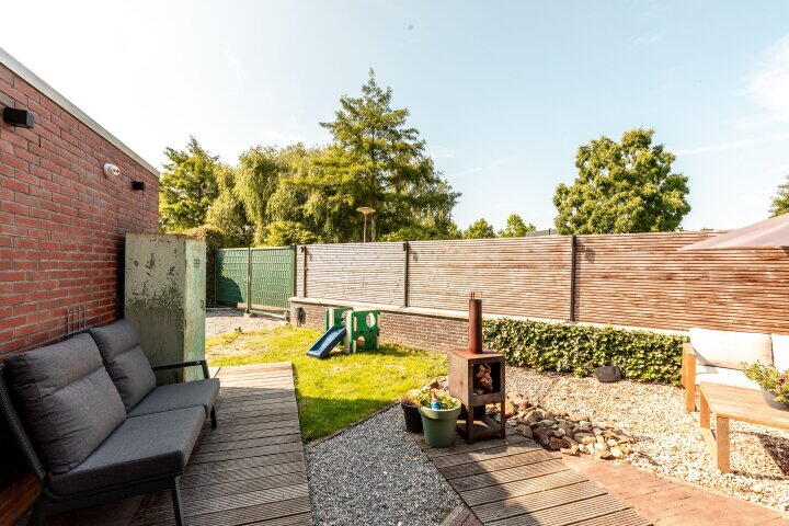 Tuin: De achtertuin loopt in een punt en meet op het diepste punt ca. 20 meter, is pal op het zuiden gesitueerd en voorzien van deels gemetselde erfafscheidingen, diverse beplanting, een ruim terras bij de woning, een achterom en toegang tot de stenen garage welke is voorzien van elektra. De forse zijtuin is op het zuid-westen gesitueerd en biedt u naast optimale privacy ook nog eens het privilege van de zon tot in de late uurtjes. Dit is echt genieten!
